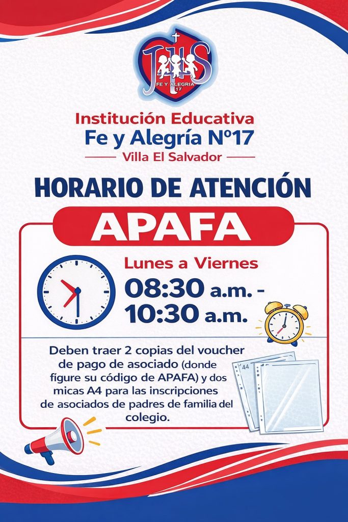 Les informamos que el horario de atención de APAFA será de lunes a viernes, de 8:30 a.m. a 10:30 a.m., solo hasta el 23 de enero. Para las inscripciones de asociados, deberán traer: